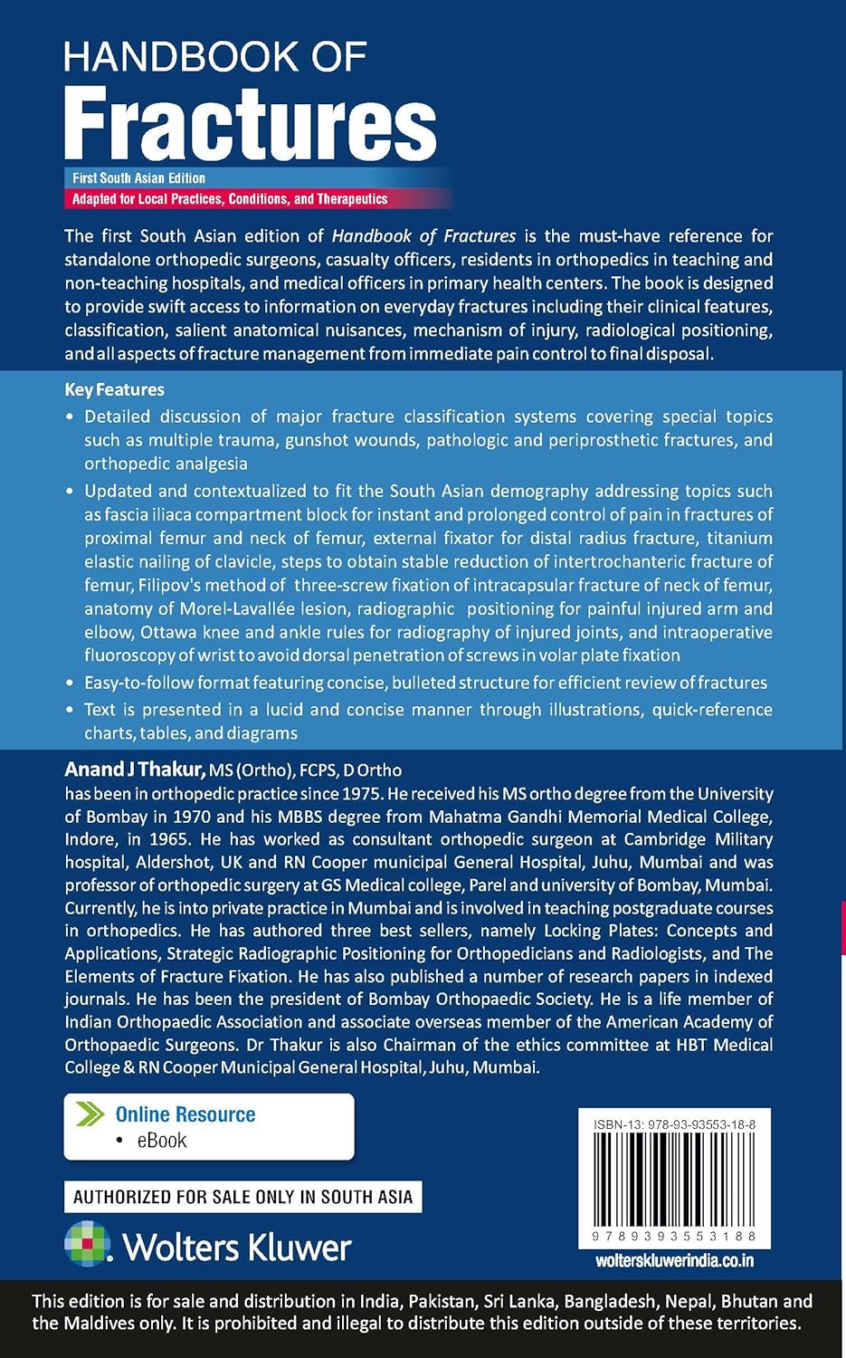 The South Asian edition of Handbook of Fractures is the must-have reference for standalone orthopedic surgeons, casualty officers, residents in orthopedics in teaching and nonteaching hospitals, and medical officers in primary health centers. The book is designed to provide swift access to information on everyday fractures including their clinical features, classification, salient anatomical nuisances, mechanism of injury, radiological positioning, and all aspects of fracture management from immediate pain control to final disposal.